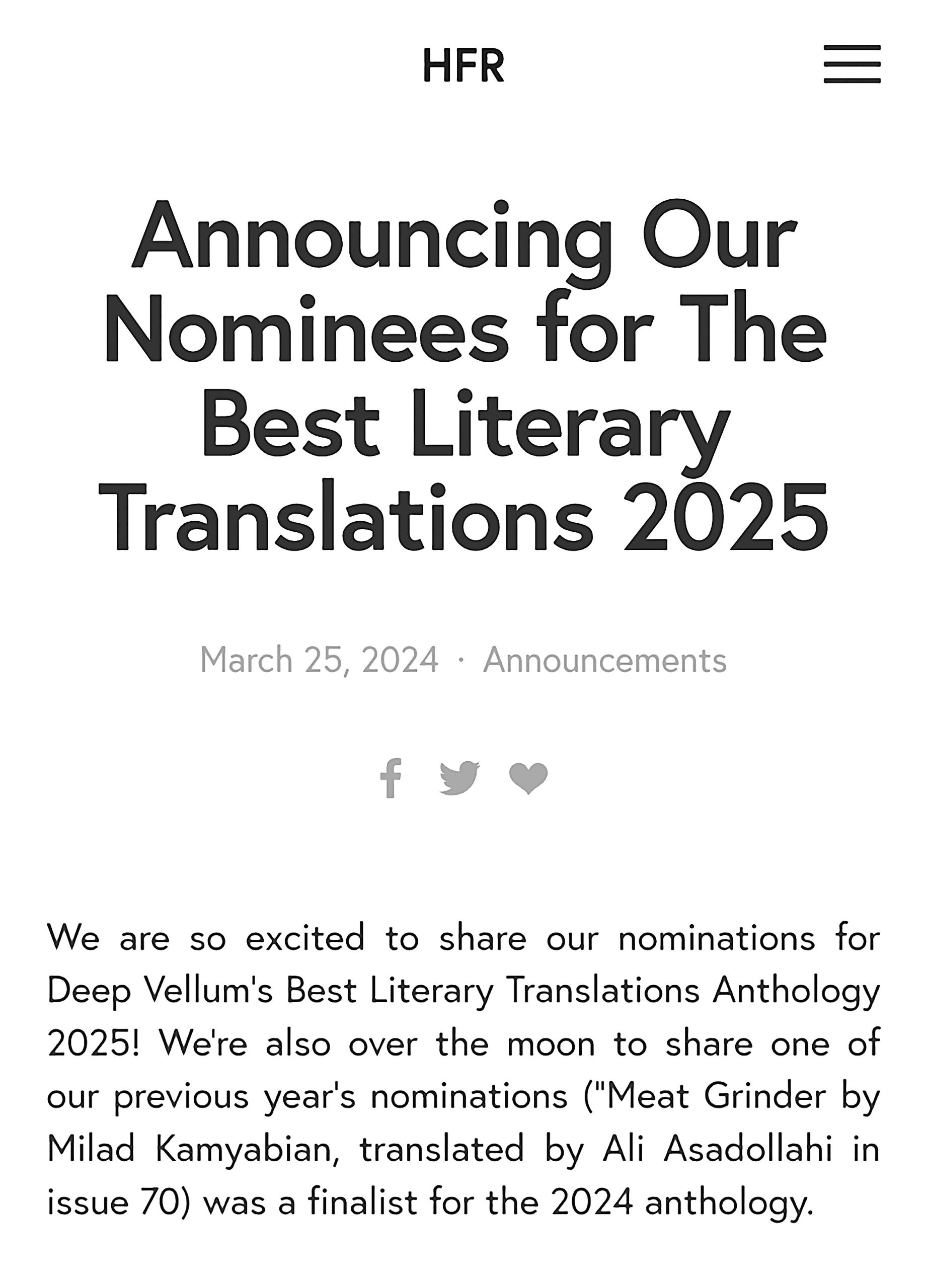 این ترجمه همچنین همراه با ۸ اثر دیگر (اعم از شعر و داستان) از سوی HFR برای جایزهٔ بهترین ترجمهٔ ادبی ۲۰۲۴ (Deep Vellum) نامزد شده بود–که در نهایت تنها نامزد این ژورنال بود که فینالیست و چاپ شد (خبرش اینجاست).