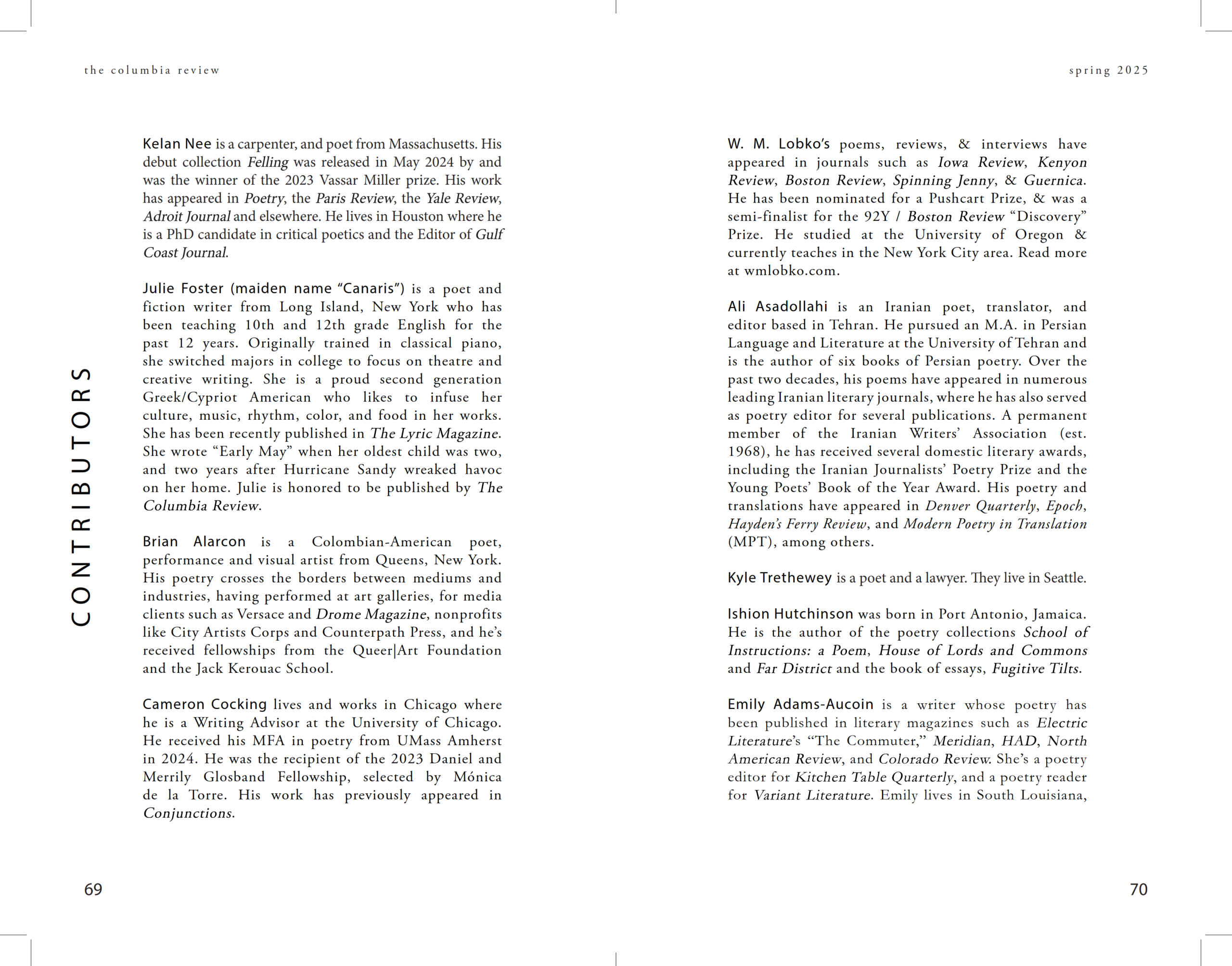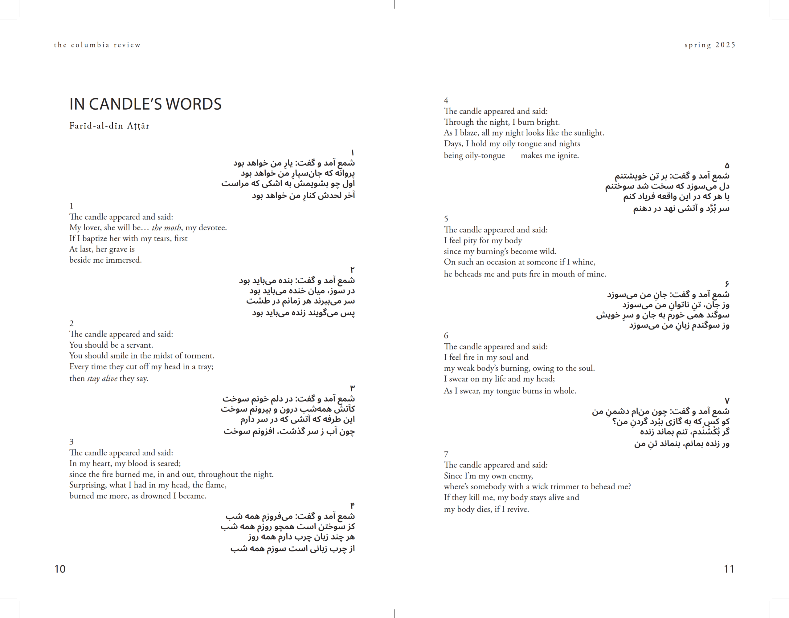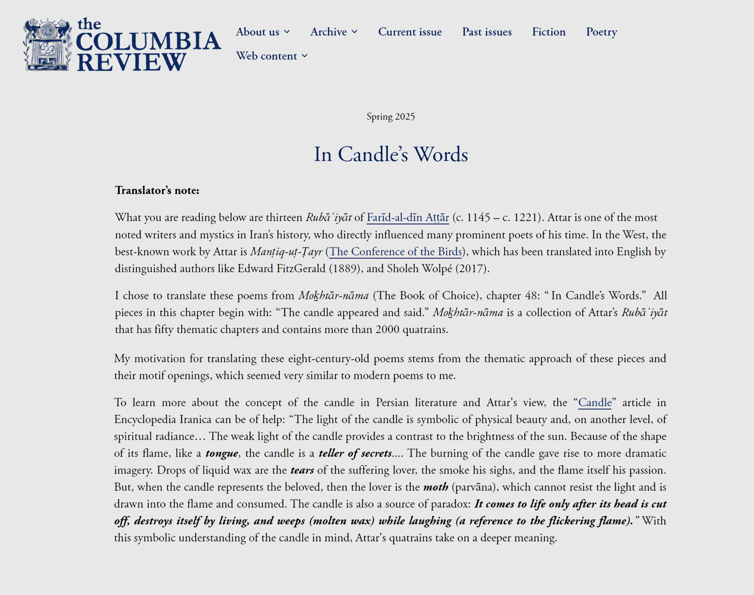 مجلهٔ ادبی Columbia Review که قدیمی‌ترین نشریهٔ ادبی دانشگاهی در ایالات متحده است، ۱۰ رباعی از عطار را به ترجمهٔ من منتشر کرده است. این ۱۰ رباعی از کتاب مختارنامه و دفتر در سخن گفتن به زبان شمع انتخاب شده است. پیش‌تر ۳ رباعی از همین دفتر را در مجلهٔ Blue Unicorn ارائه کرده بودم.