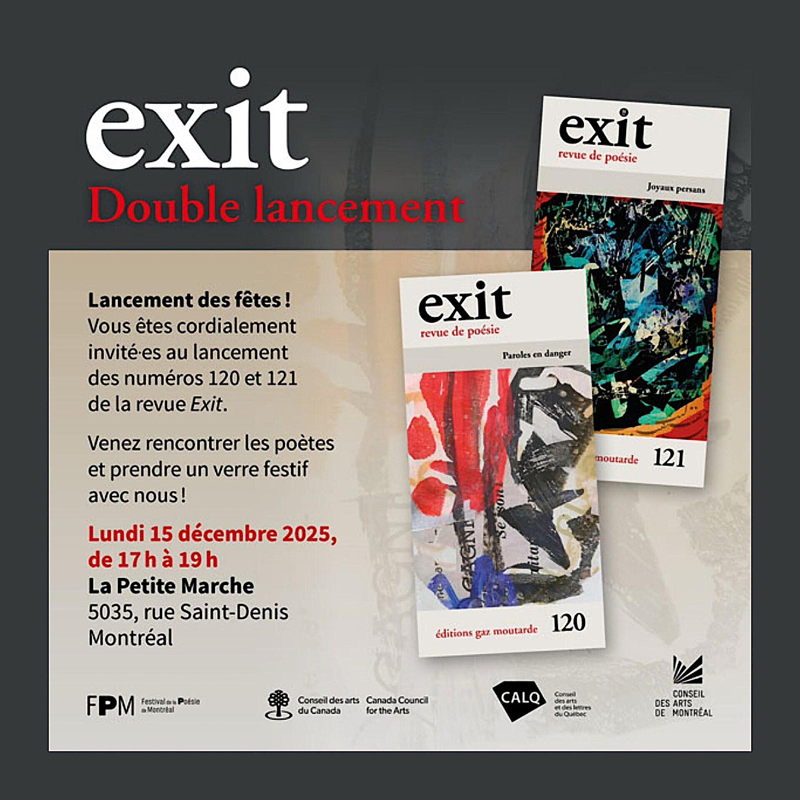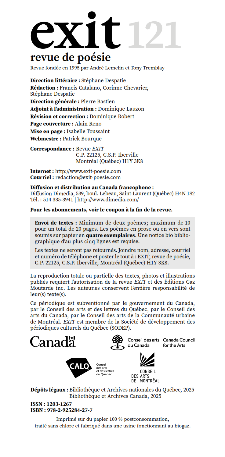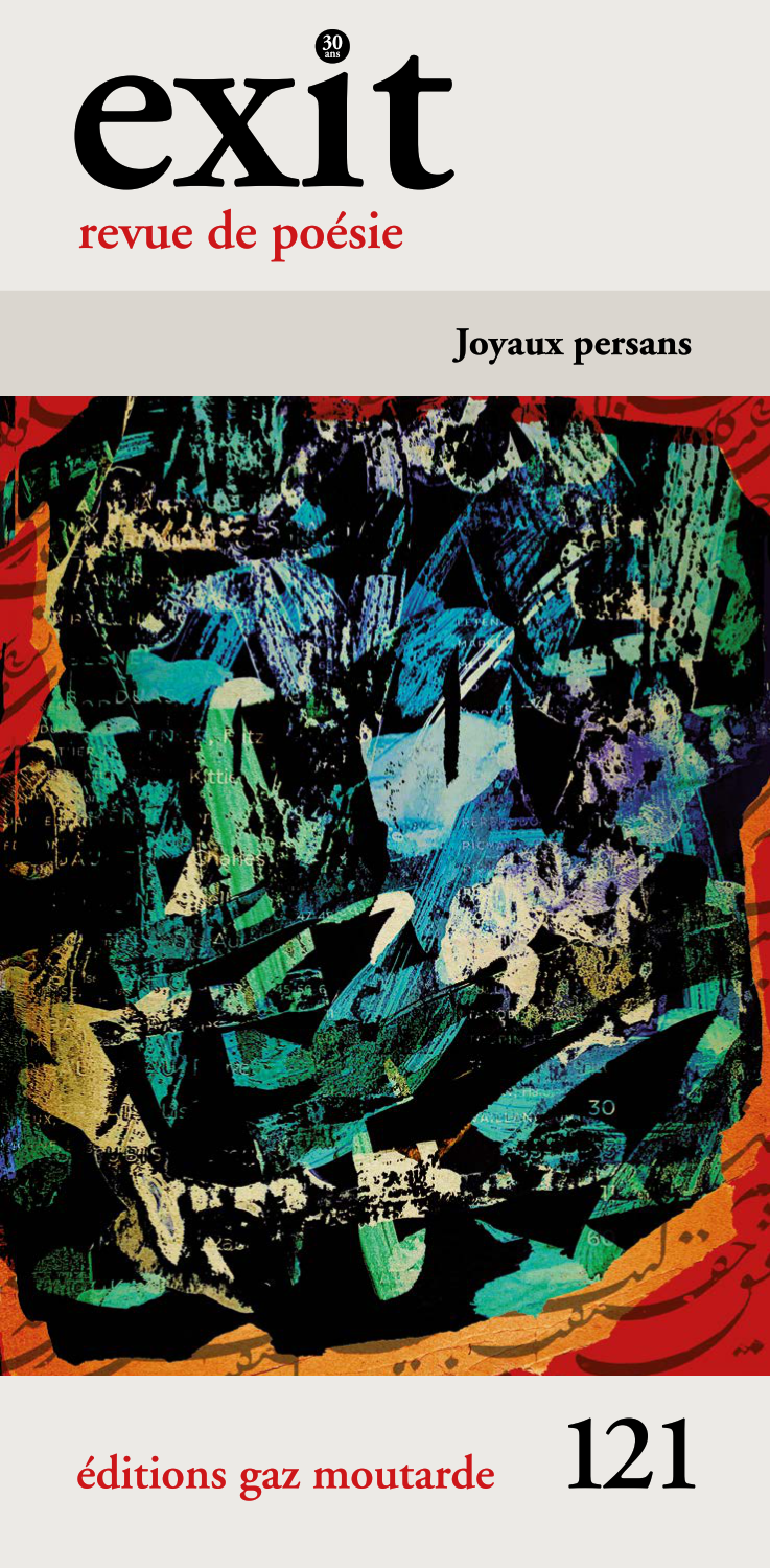شماره‌ی ۱۲۱ مجله‌ی شعر فرانسوی‌زبان و باسابقه‌ی اکسیت Exit Poesie در کانادا به شعر امروز فارسی اختصاص دارد. در این شماره، آثار ردیفی از شاعران کاربلد و تردست به‌همت و ترجمه‌ی پرستو نصراله‌زاده و برترانْد لوردور به زبان فرانسوی ارائه شده است.