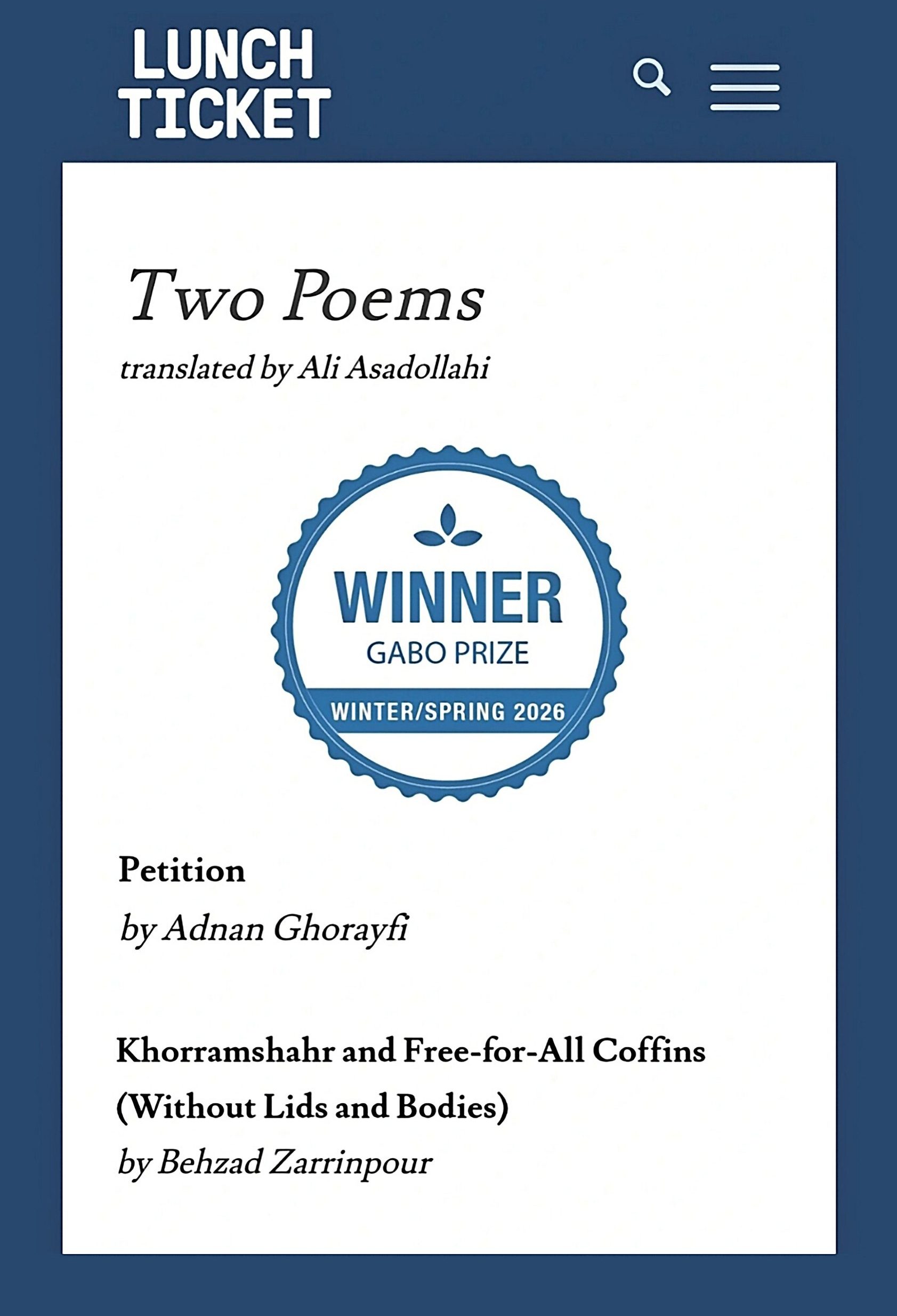 حال این دو شعر به انگلیسی و فارسی در نشریهٔ دوستداشتنی Lunch Ticket منتشر شدهاند (اینجا بخوانید)؛ و همزمان جایزهٔ Gabo (بهترین ترجمهٔ ادبی) را ار این مجله گرفتهاند. جایزهٔ گابو به افتخار گابریل گارسیا مارکز چنین نامگذاری شده است.